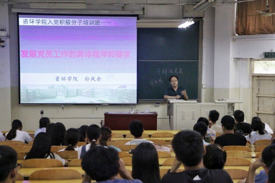 为加强对入党积极分子的教育和培养,切实增强其对党的路线、方针、政策的认识和理解,进一步端正入党动机,严把“入口关”,6月25日下午,我院新一期入党积极分子培训班在资环楼103室开班。第一次集中培训由院党委专职组织委员孙凤余担任主讲。