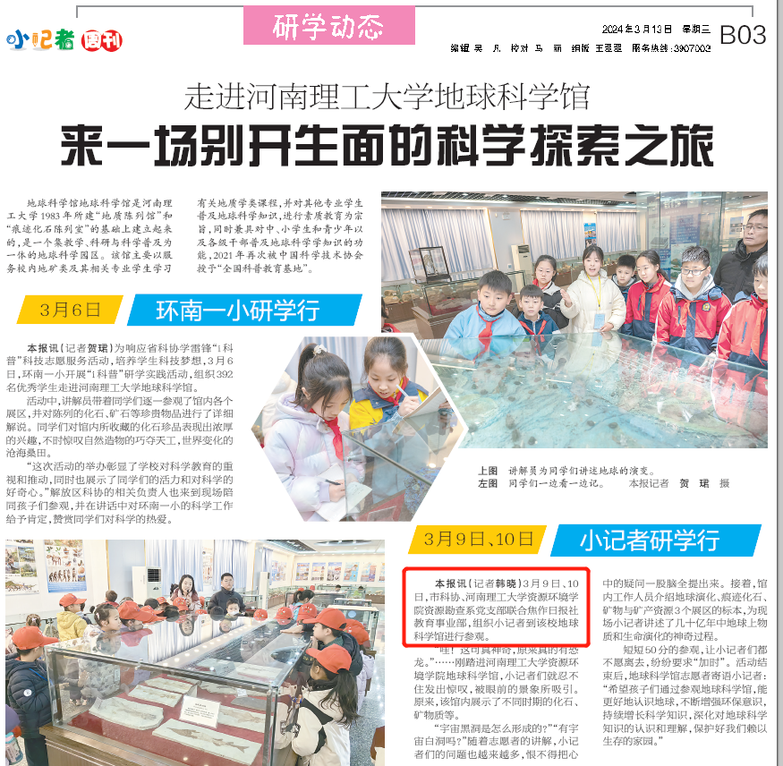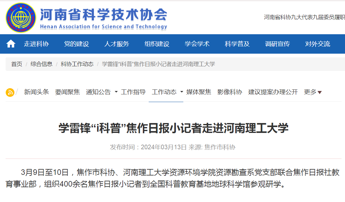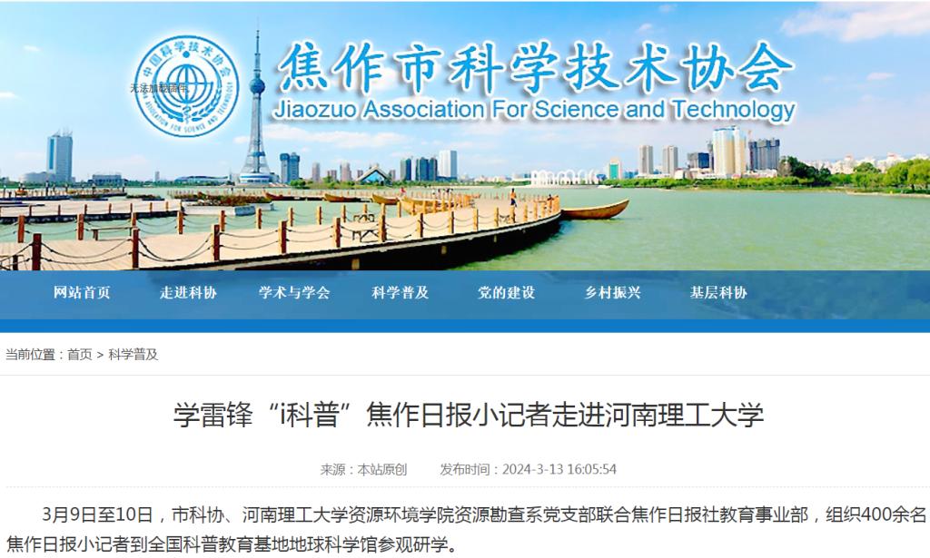 资环学院资勘系党支部按照新时代党建要求,以建设中国特色世界一流的地质资源与地质工程学科为目标,探索建立起以立德树人为核心,以一流学科建设和一流本科建设为两翼的党建工作体系,走出了一条“‘党建+’奏响立德树人”高校党建特色之路,受到河南日报客户端、”学习强国”学习平台、河南日报农村版等主流媒体广泛报道,党支部三级联创相关活动受到河南省科学技术协会、焦作市科学技术协会、焦作晚报、焦作日报教育之声视频号等媒体报道,引发热烈反响。相关内容如下: