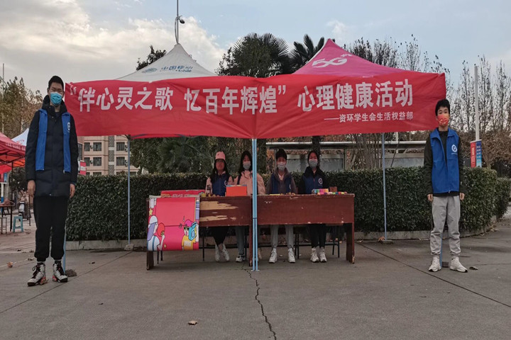 为深入了解细致摸排大学生心理健康状况,11月21日,资源环境学院学生会生活权益部在学苑餐厅东门举行了“伴心灵之歌,忆百年辉煌”心理健康文化活动。