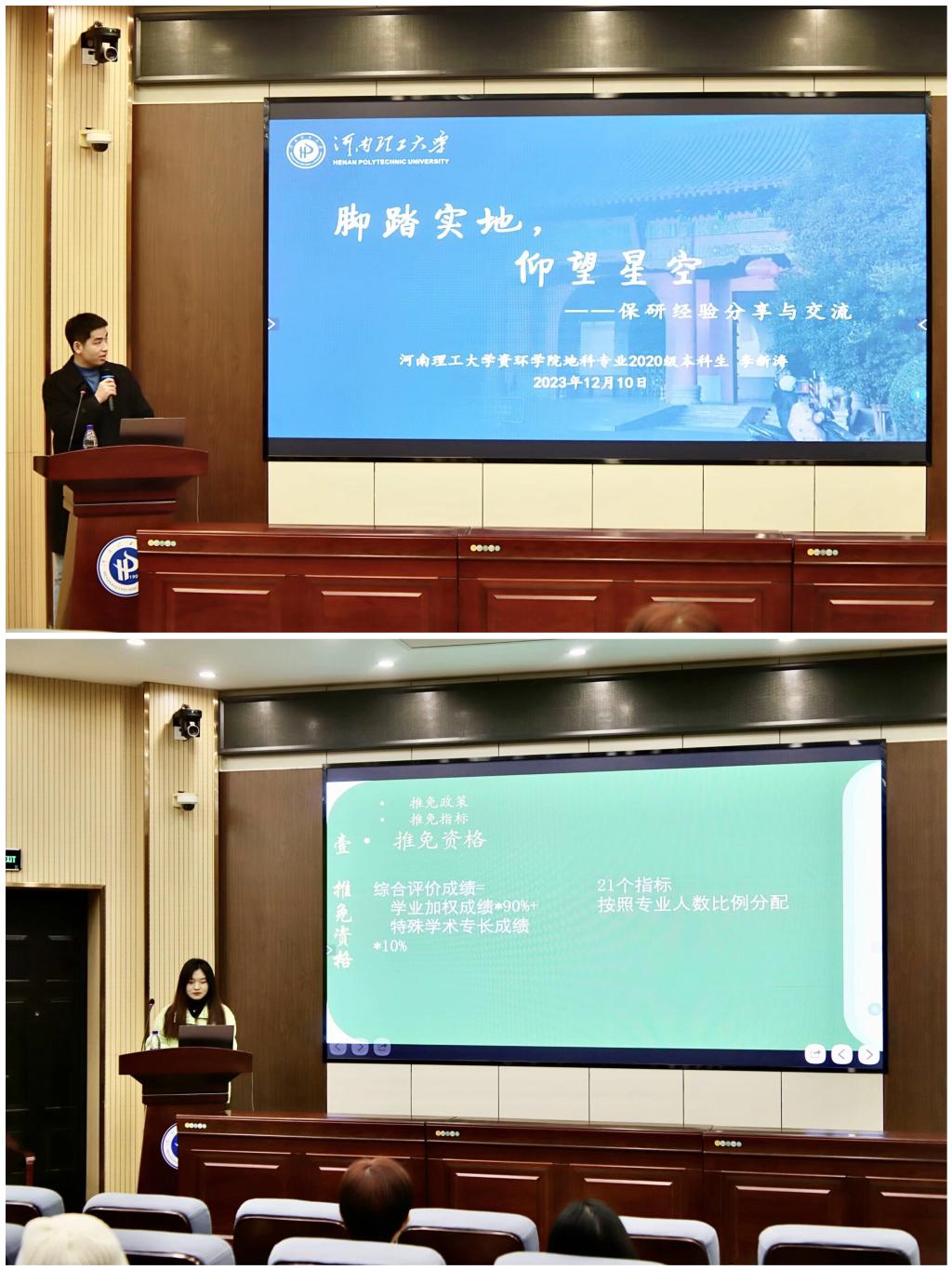 为积极发挥优秀学子带头示范作用,提高学生对保研政策的了解与认识,营造良好的学习氛围,12月10日下午,我院“筑梦青春,成就自我”宣讲团在资环楼第Ⅰ学术报告厅举行第一场宣讲活动,活动内容为保研学生经验分享会。会议邀请了优秀保研学子李新涛和刘钰钦来为低年级同学分享经验、答疑解惑。
