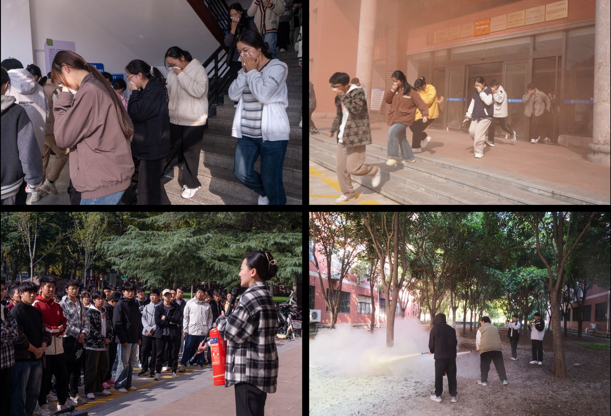 首先,新乡消防协会的严寒教官为师生现场介绍了灭火器、消防栓等常用消防器材的正确使用方法,适用场景及操作要点,并重点强调了火场中保持冷静、科学避险逃生的重要性。之后,随着消防警报声响起,火灾模拟现场生成大量浓烟,各楼层安全员迅速到位,指导师生用湿毛巾捂住口鼻、弯腰低姿,沿预定疏散路线有序穿过浓烟区域,快速向安全区撤离,整个疏散过程紧张高效、井然有序,无人员受伤。消防演练结束后,保卫处郝超老师又现场演示干粉灭火器的适用场景与“提、拔、握、压” 操作流程,并针对师生操作中的不规范动作实时纠正,确保每位参与者都能掌握正确施救方法。