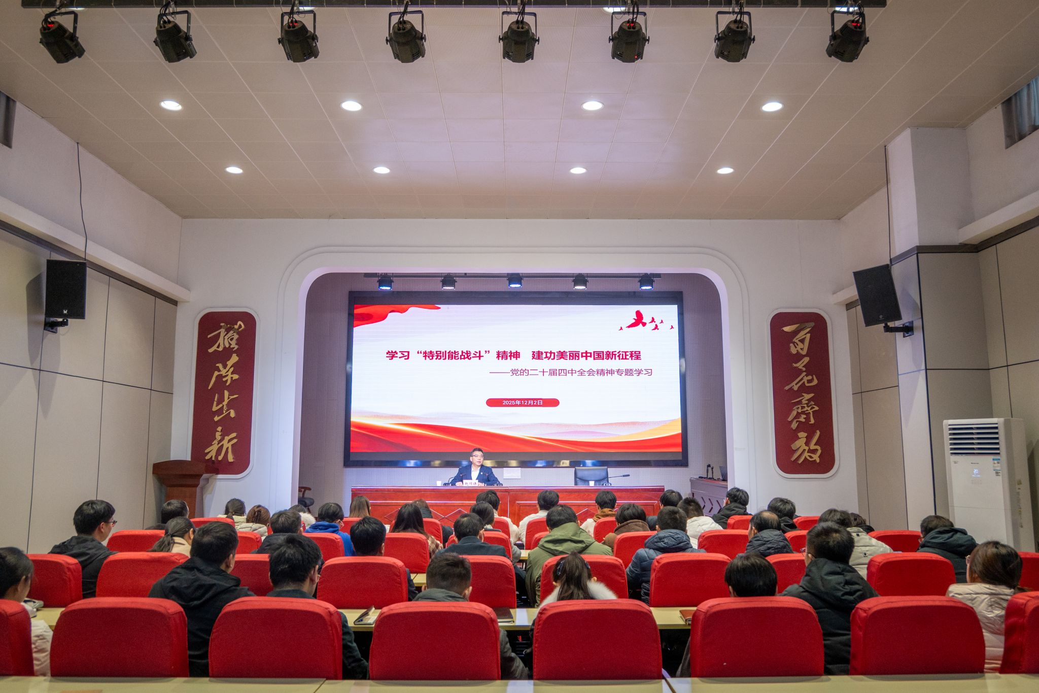 师生在参观学习焦作“西大井1919”爱国主义教育基地后,赵同谦以“学习特别能战斗精神,建功美丽中国新征程”为题讲授党的二十届四中全会专题思政课,从西大井与学校的历史渊源和成功转型实践等切入,围绕深刻领会党的二十届四中全会的重大意义、“十五五”时期经济社会发展指导方针的丰富内涵和“加快经济社会发展全面绿色转型,建设美丽中国”战略部署的重要意义等三个层面进行深入解读。引导师生要深刻把握党的二十届四中全会精神历史方位、核心要义与实践要求。希望青年学生要培养“特别能钻研”的求实精神,沉得下心、坐得住冷板凳,在专业深耕中筑牢理论根基;要发扬“特别能创新”的进取精神,勇于开拓新方法、探索新领域,在实践磨砺中锻造过硬本领;践行“特别能担当”的使命精神,胸怀“国之大者”,将个人发展与国家需要紧密结合,在服务国家中实现人生价值。