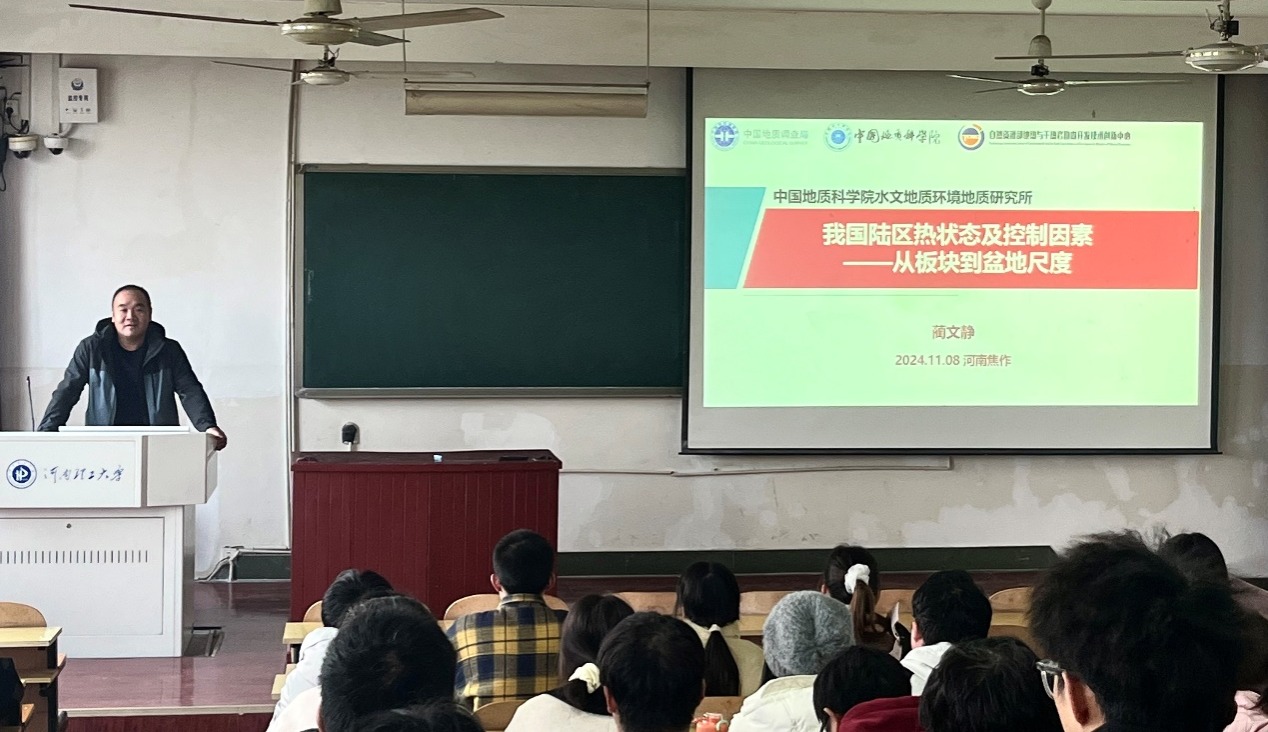 2024年11月8日,中国地质科学院水文地质环境地质研究所蔺文静研究员莅临我院,在资环楼502举行了题为《我国陆区热状态及控制因素—从板块到盆地尺度》的学术报告,吸引了相关专业教师和众多学生前来聆听。