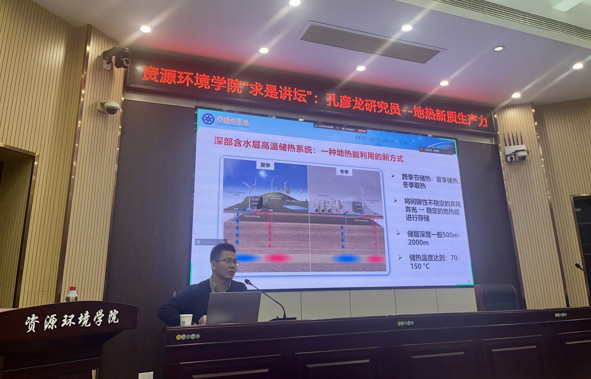 2024年11月14日上午,国家优秀青年基金获得者、中国科学院地质与地球物理研究所孔彦龙研究员应邀在资环第1学术报告厅为我校师生作了题目为《地热新质生产力》的专题报告,学院100余名师生参与了本次报告。