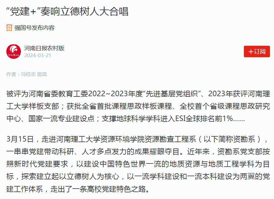 资环学院资勘系党支部按照新时代党建要求,以建设中国特色世界一流的地质资源与地质工程学科为目标,探索建立起以立德树人为核心,以一流学科建设和一流本科建设为两翼的党建工作体系,走出了一条“‘党建+’奏响立德树人”高校党建特色之路,受到河南日报客户端、”学习强国”学习平台、河南日报农村版等主流媒体广泛报道,党支部三级联创相关活动受到河南省科学技术协会、焦作市科学技术协会、焦作晚报、焦作日报教育之声视频号等媒体报道,引发热烈反响。相关内容如下: