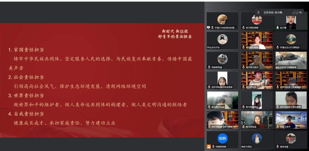 为进一步引导青年大学生自觉把思想和行动统一到党的二十大精神上来,我院于11月17日晚组织召开学习贯彻党的二十大精神宣讲活动,本次宣讲会以线上的方式开展,由我院团委负责人刘小梅主讲,学生团干及青马班全体成员共230人参加。