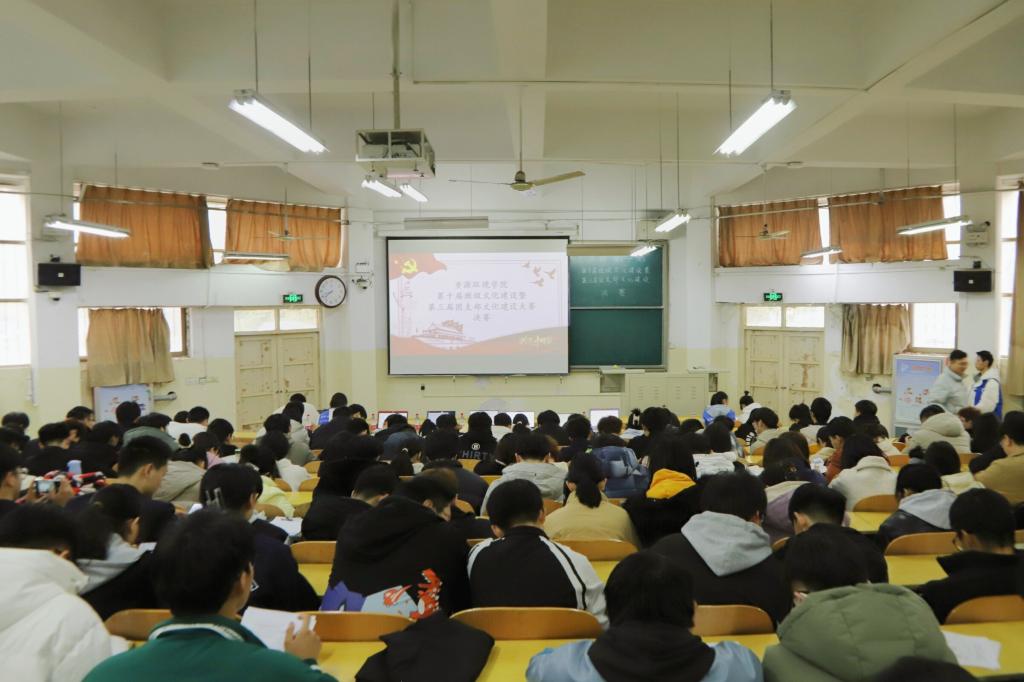 活动伊始,全体起立,奏唱团歌。接着,各班代表按抽签顺序上台对自己班级在“五班四制”班级文化建设和“两制一领一学”团支部文化建设中开展的工作和取得的成果进行汇报与展示。随后,评委老师根据各班的书面材料与汇报内容进行点评和提问,各班答辩选手进行回答。比赛过程中主讲选手铿锵有力的发言、评委老师言简意深的点评以及答辩选手精彩纷呈的辩论,将活动氛围推向高潮。在经过激烈的角逐之后,环境2101班荣获一等奖,水文2102班和环境2102班荣获二等奖,水文2103班等三个班级荣获三等奖。