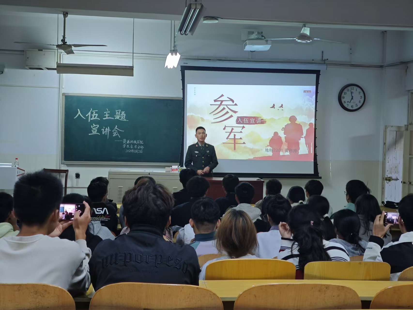 为帮助学生全面了解征兵政策,激发大学生参军入伍热情,鼓励和引导毕业生积极应征入伍,11月2日下午,我院学生会学习部在资环楼402开展以“携笔从戎,无悔青春”为主题的应征入伍政策宣讲会,并邀请退伍军人学生代表黄烈涛为同学们宣讲。
