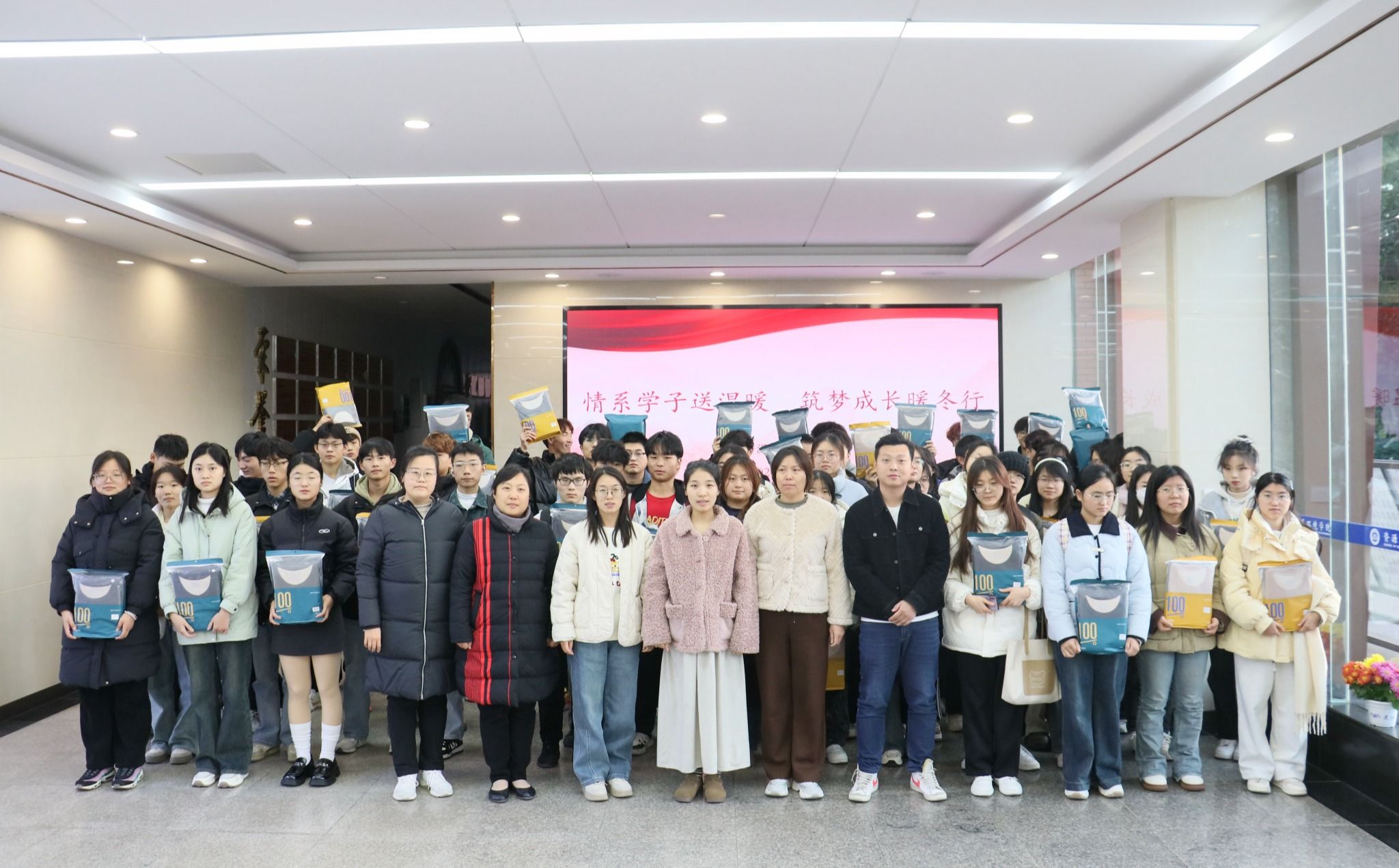 为确保家庭经济困难学生安心过冬,深入做好家庭经济困难学生的关心关爱工作,充分发挥学院资助育人实效,11月25日下午,我院在学院大厅开展“情系学子送温暖 筑梦成长暖冬行”冬季送温暖活动,全体辅导员及学生代表参加活动。