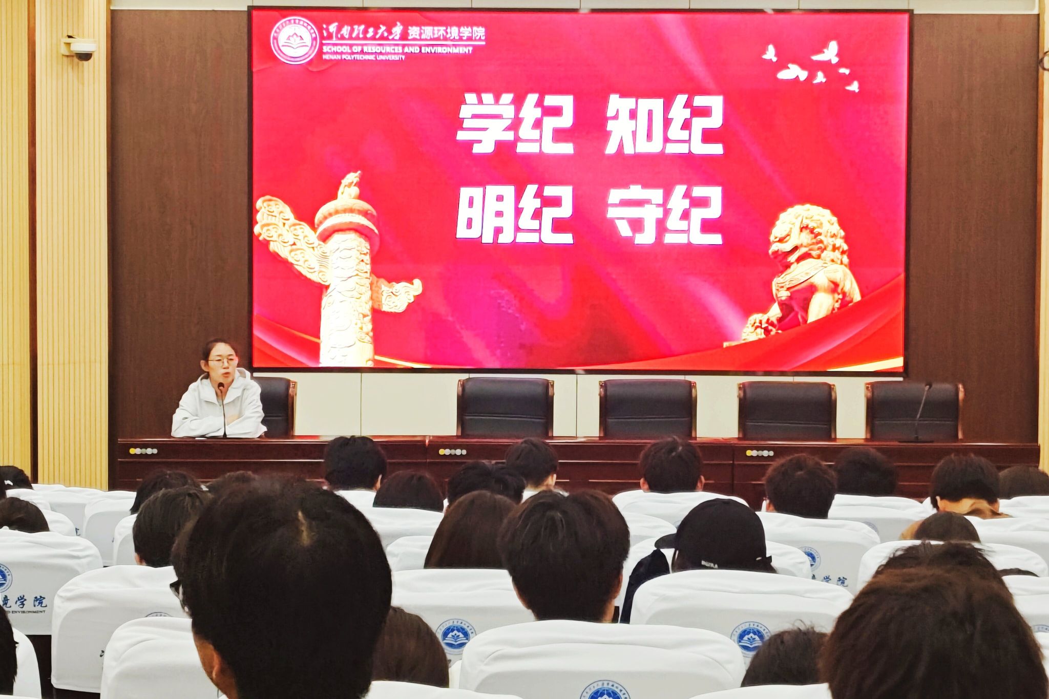 为深化学生思想政治引领,筑牢纪律规矩意识,我院于5月22日晚在资环楼第Ⅰ学术报告厅组织召开专题座谈会。学院团委副书记王梦利以“学纪知纪明纪守纪”为主题,面向学生社团组织中党员、团员及党团积极分子开展专题教育,百余名青年骨干齐聚一堂,共话纪律建设。