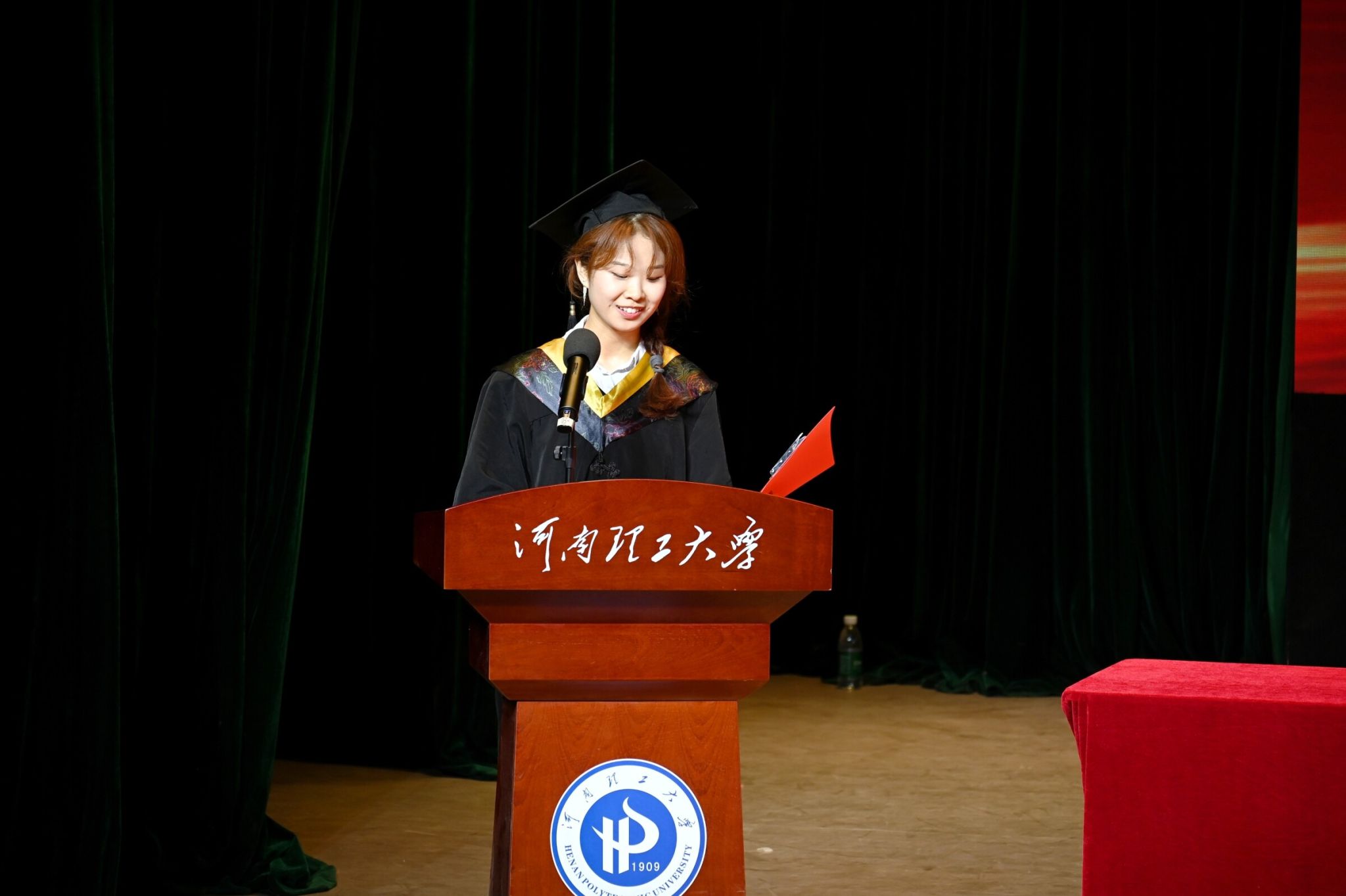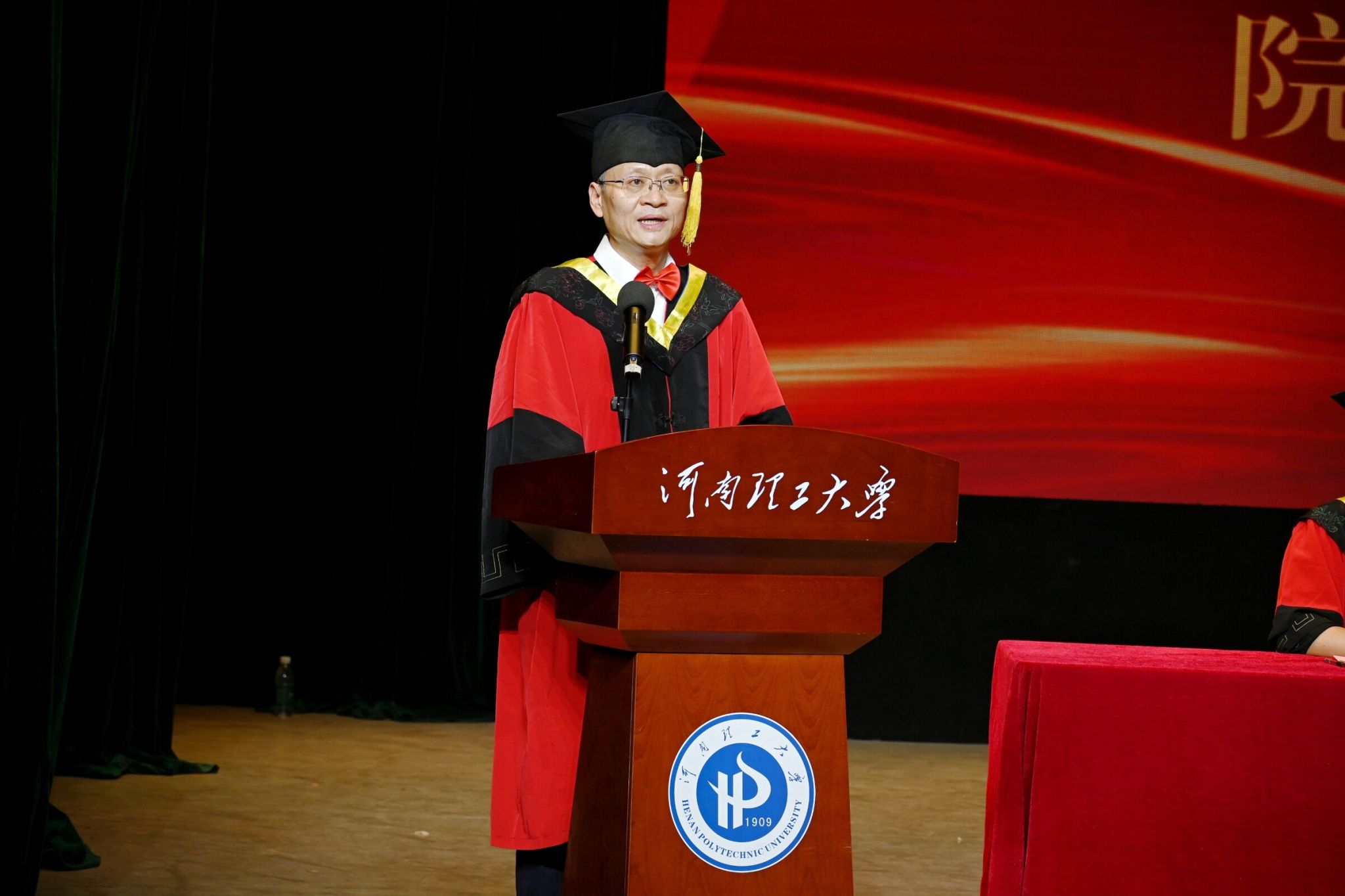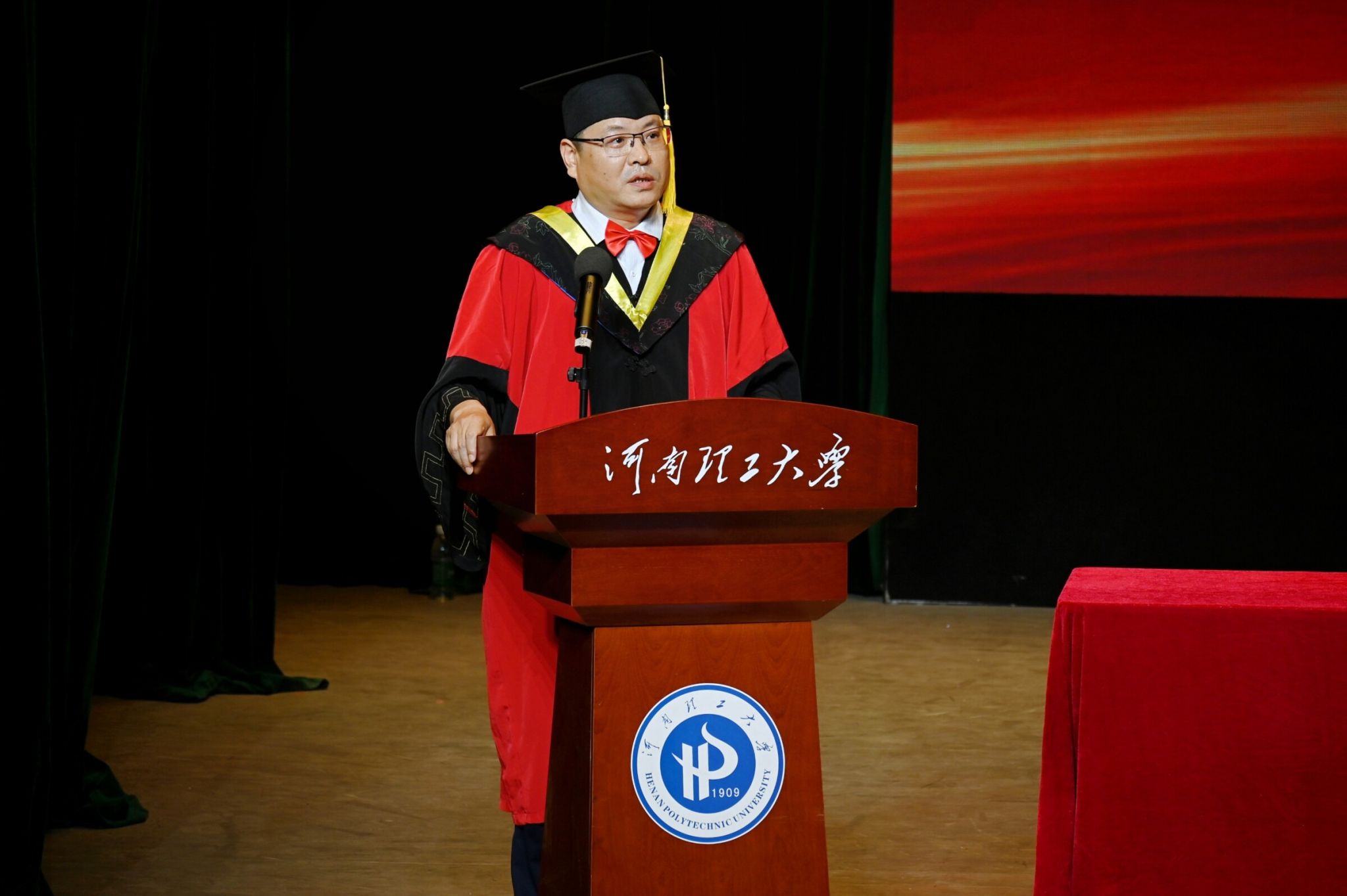 庄严的国歌声中,毕业典礼正式拉开帷幕。毕业生代表张艺佳发言,她深情回顾了在河南理工大学度过的难忘时光,表达了对母校悉心培育、师长谆谆教诲和同窗深厚情谊的由衷感激,并展望了对未来的美好憧憬。教师代表武亚遵教授随后发言,他结合自身经验为毕业生们提出宝贵建议,激励大家勇敢追梦,春风化雨般的师恩令在场学子动容。