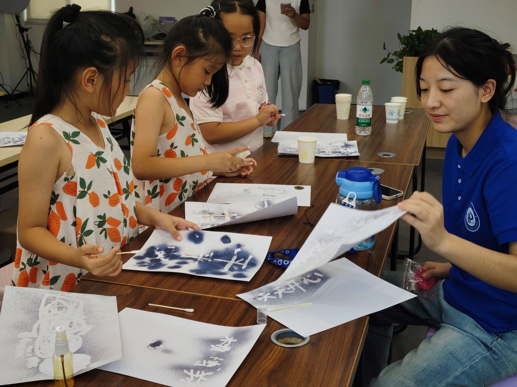 “加密通话”课堂则充满了神秘色彩。志愿者用维生素C溶液书写“密信”,当孩子们喷洒碘水,消失的字迹神奇显现。亲手制作和传递密信的过程,让孩子们在奇妙的化学变化中初窥信息加密的奥妙。夕阳西下,孩子们仍意犹未尽地围着志愿者创作自己的“密码信”。这场科学盛宴,让空气动力学与化学原理变得可触可感,更在童心播下探索的种子。这份盛夏的科学热忱,终将在未来绽放智慧之花。