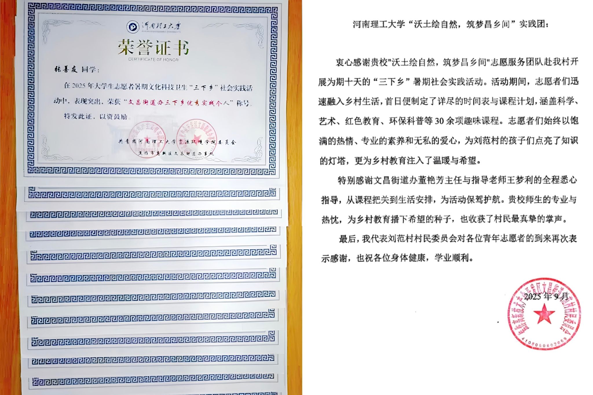 实践期间,团队成效显著获多方肯定。所在街道办为全体队员颁发“优秀实践个人”荣誉证书,表彰其在乡村振兴与教育发展中的贡献;刘范村村委会特致表扬信并赠送锦旗,点赞大学生的奉献精神与实践成果。