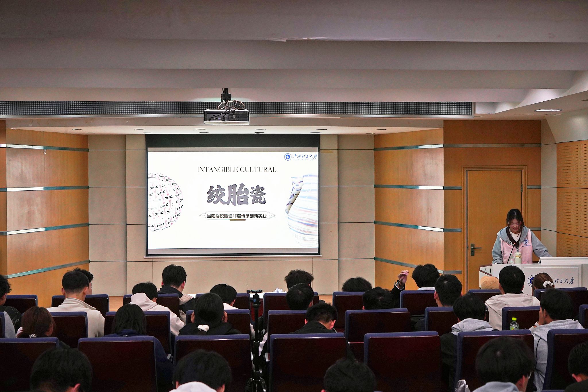 活动伊始,王云昊结合自身专业积累与学习经验,为同学们讲解地质专业相关知识,围绕课程体系、专业发展方向、实践应用场景等内容展开分享,并针对新生在大学适应、学业规划、能力提升等方面的疑问进行细致解答。随后,李姝荟向同学们系统介绍了当阳峪绞胎瓷的历史渊源、独特魅力及精湛制备工艺。作为我国非遗文化中的瑰宝,绞胎瓷以不同颜色的瓷土揉合,经拉坯、烧制等多道工序制成,成品纹理如行云流水、似鸟羽交错,每件作品皆为独一无二的艺术珍品。它不仅承载着精湛的手工技艺,更蕴含着中国传统文化的深厚情感与核心价值观,是历史与艺术的完美融合。她指出,即便在现代社会,绞胎瓷依然是极具生命力的文化符号。随着中华优秀传统文化的创新发展,越来越多的年轻陶瓷艺术家在坚守传统的基础上,大胆融入现代元素,将绞胎瓷与当代生活、时尚趋势相结合,打造出众多富有创意的文创产品,让这一古老非遗在新时代焕发了新的生机与活力。