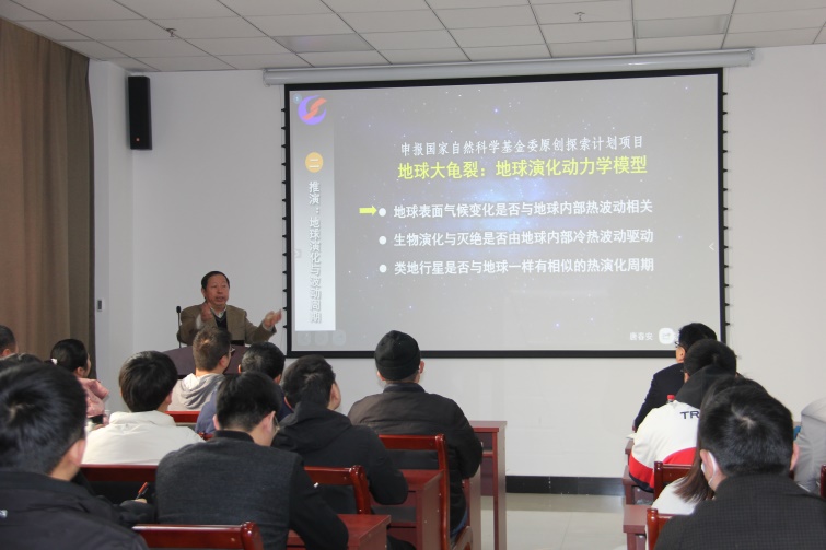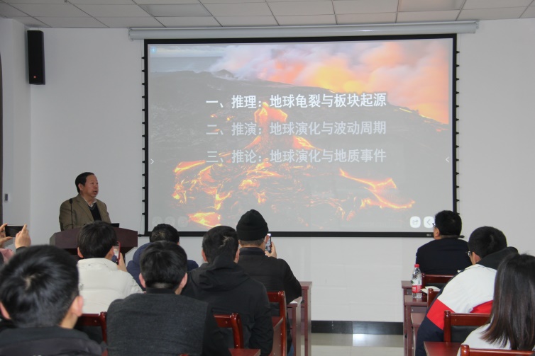 报告会上,唐春安教授首先讲述了《地球大龟裂》学术报告主题的由来及近二十年来他在该项研究上所付出的艰辛努力和思考。接着唐教授从推理:地球龟裂与板块起源;推演:地球演化与波动周期;推论:地球演化与地质事件三个方面给大家做了一个热情洋溢、引人入胜的学术报告。最后从构造板块的形成、地球表面气候变化、生物演化与灭绝、雪球事件、大氧化事件、地表沙漠形成、蒸发岩成因、红层成因、水循环、全球变暖等十个方面的重大地学问题与从地球大龟裂关系提出了自己的见解和展望。此次报告会的开展,大家纷纷表示收获颇丰,不仅拓宽了师生的学术视野,让大家感觉收获了满满。同时,也让大家感受到科学家对解决重大科学问题的的激情和热爱。