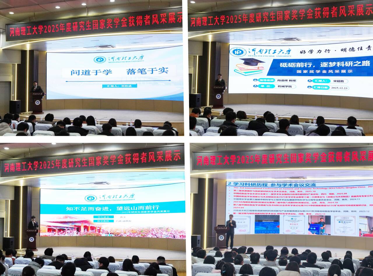 为充分发挥榜样示范引领作用,展现研究生的精神风貌,扎实推进研究生资助育人实效,助力研究生全面成长成才,12月23日下午,2025年研究生国家奖学金获得者风采展示活动在力行楼圆形报告厅顺利举行。活动由党委研究生工作部、研究生院主办,我院承办,来自全校各学院的26位研究生国家奖学金获得者优秀代表参加展示,二百余名研究生现场观看。