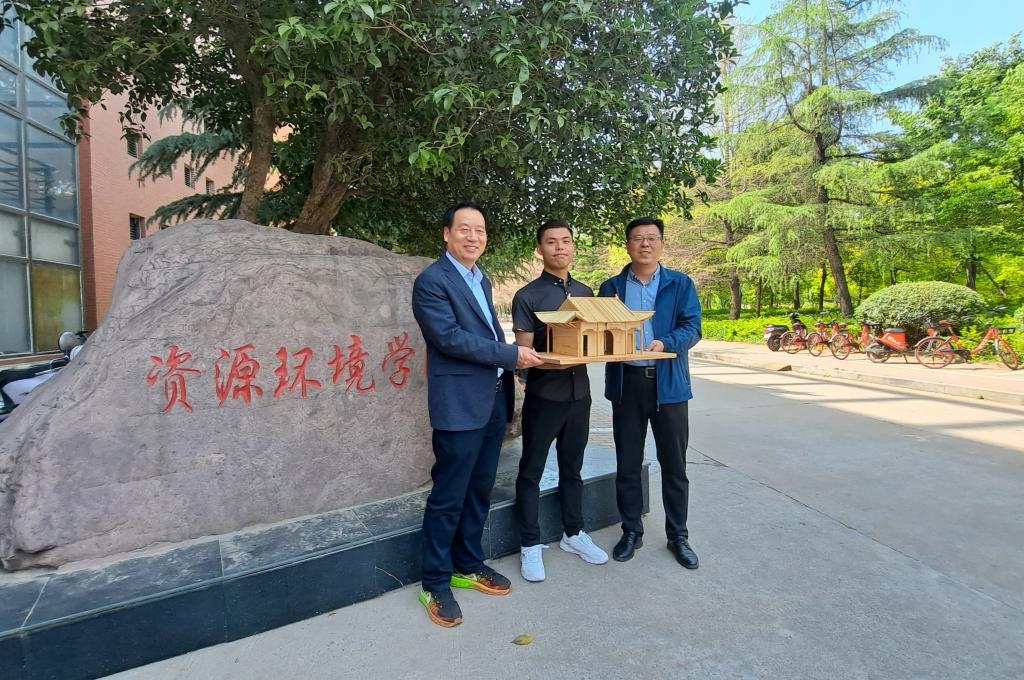 铭记师恩,感怀母校。毕业前夕,我院2022届毕业生代表韩磊向学院赠送了以学校西门为原型的手工艺品,学院领导罗绍河、孙付伟代表学院共同接收这份礼物。