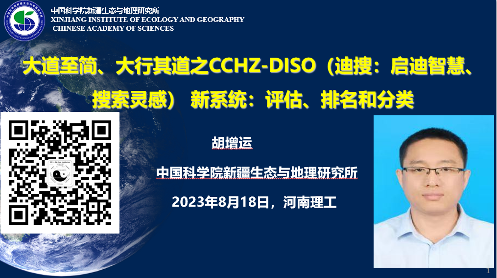 8月18日上午,应我院邀请,中国科学院新疆生态与地理研究所的胡增运研究员在国家重点实验室901报告厅作了《大道至简之----CCHZ-DISO评估系统》的学术报告,我院部分在校的教师和研究生等20多人参加了研讨。学术报告会由水文系副教授刘永和主持。