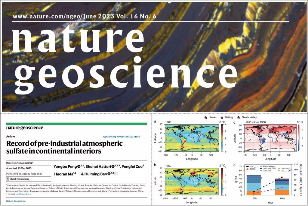 近日,我院青年教师左鹏飞博士与南京大学鲍惠铭、彭永波教授合作以共同作者在国际地学顶刊《自然-地球科学》(《Nature Geoscience》),发表题为《陆内工业化前大气中硫酸盐的记录》(《Record of pre-industrial atmospheric sulfate in continental interiors》)的研究成果,实现了学院顶级学术成果的历史性突破。