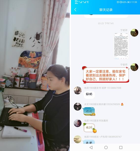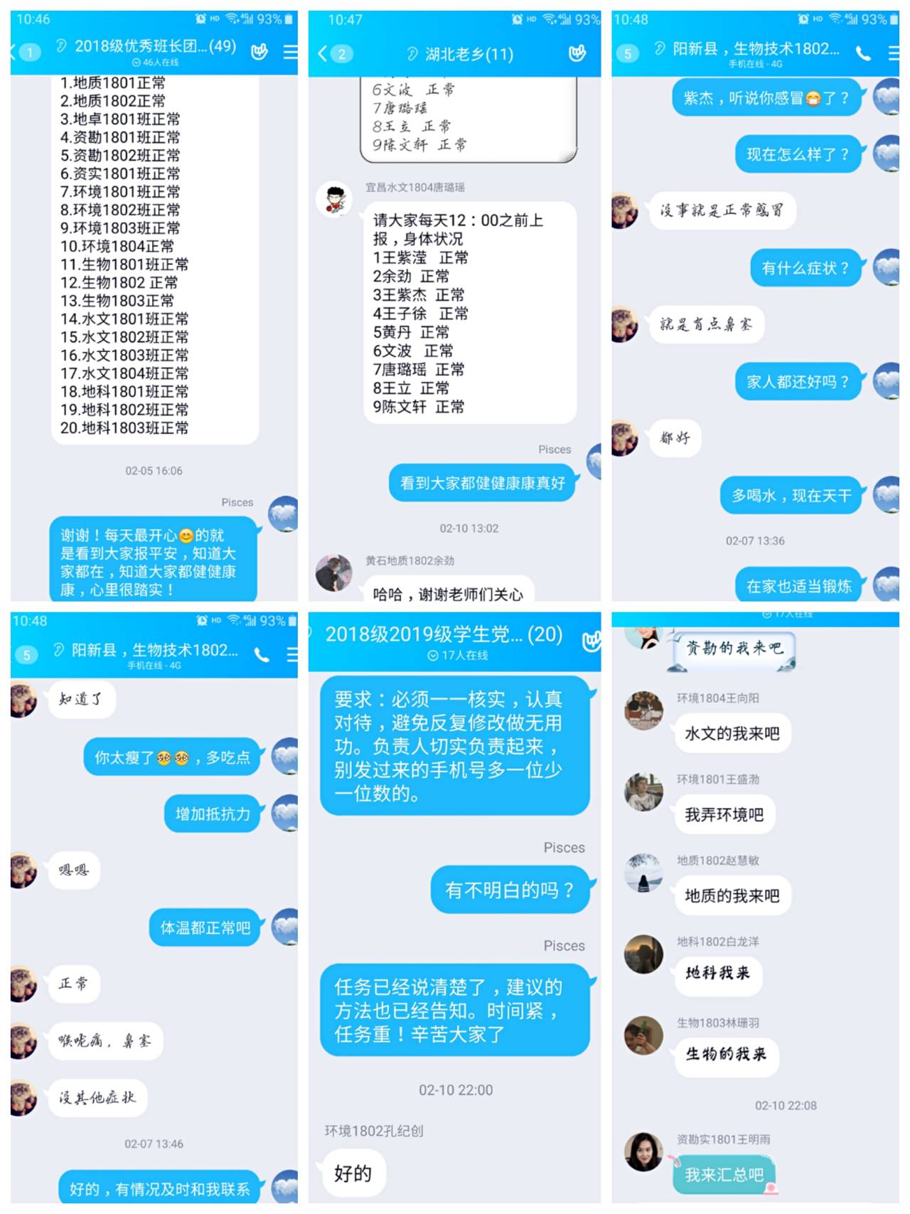 我是资源环境学院2019级辅导员宁淑媛,作为一名老辅导员,2003年的非典,我还是一名大三在校生,经历了几个月的封校,记忆尤深。面对突如其来的疫情,对新型冠状病毒一直比较敏感的我于腊月27那天在qq群里呼吁学生注意防范,敲响警钟!紧接着资源学院辅导员团队第一时间投入这场没有硝烟的战役中。腊月28,距离过年还有2天,我和陈青老师摸清了2019级所有湖北学生的情况,并一个一个打电话落实学生是否隔离,有没有症状,目前生活状况如何,让这些身在疫区的孩子们感受到来自母校的关爱。2020农历春节注定是难忘的,辅导员们用自己的行动对抗疫情,成了这个春节特殊的主题。大年三十、大年初一,我们放缓了与家人的团聚,利用微信、QQ、钉钉、微博等一切可以Q利用的媒介,提醒每一个同学关心自己和家人的身体情况,做好隔离和防护,隔离不隔心,断疫不断情,每一次qq头像的闪动、每一条温暖的消息都是我们对学生的惦念,都是辅导员的责任与良心!