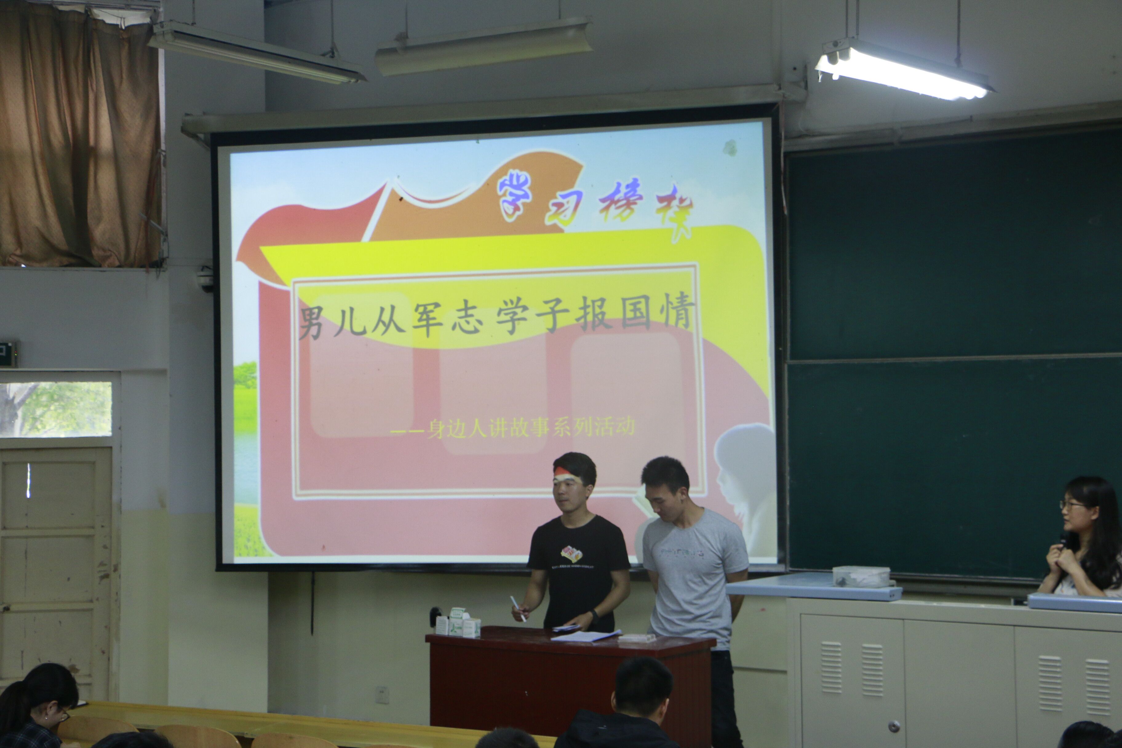 5月25日下午,我院在学院104教室开展“男儿从军志 学子报国情”典型事迹交流会,我院优秀退役大学生士兵宋锐、陈莹法应邀进行典型事迹汇报,200余名学生参加了活动。该交流会是我院积极开展“身边人讲故事”活动之一。