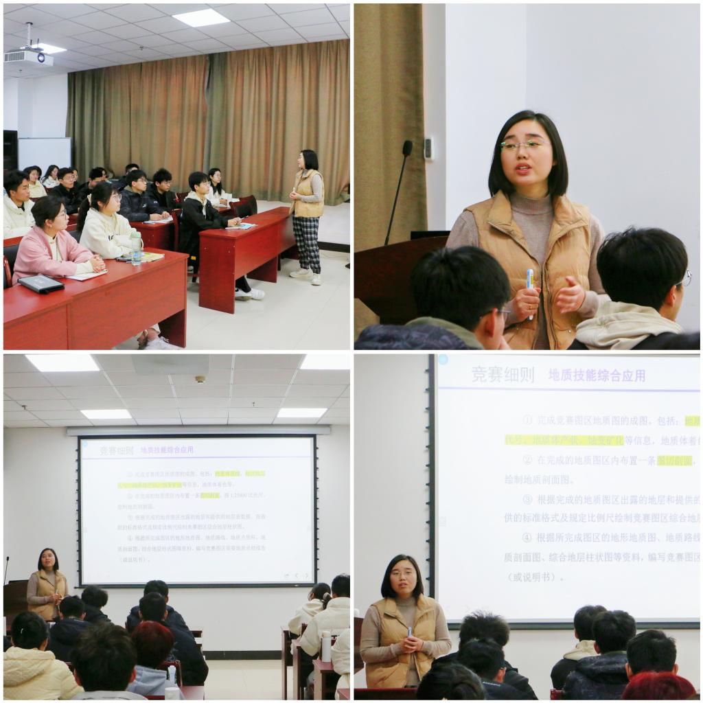 培训会上,程南南首先为同学们介绍了关于地质技能综合应用的竞赛细则,并向大家展示了某区域地质图和往年获奖作品,激发了学生对于此次构造培训的学习热情。随后,她围绕地质填图注意事项、图切剖面的绘制和分析褶皱/断层等地质构造发育特征三个方面展开详细讲解。最后,她和同学们针对地质技能大赛中可能出现的难点和热点问题进行了深入探讨,为同学们提供了宝贵的经验和建议。经过此次培训,同学们纷纷表示,他们对地质技能综合应用有了更具体深入的理解,之后将充分利用所学知识和技能,争取在比赛中取得优异成绩。