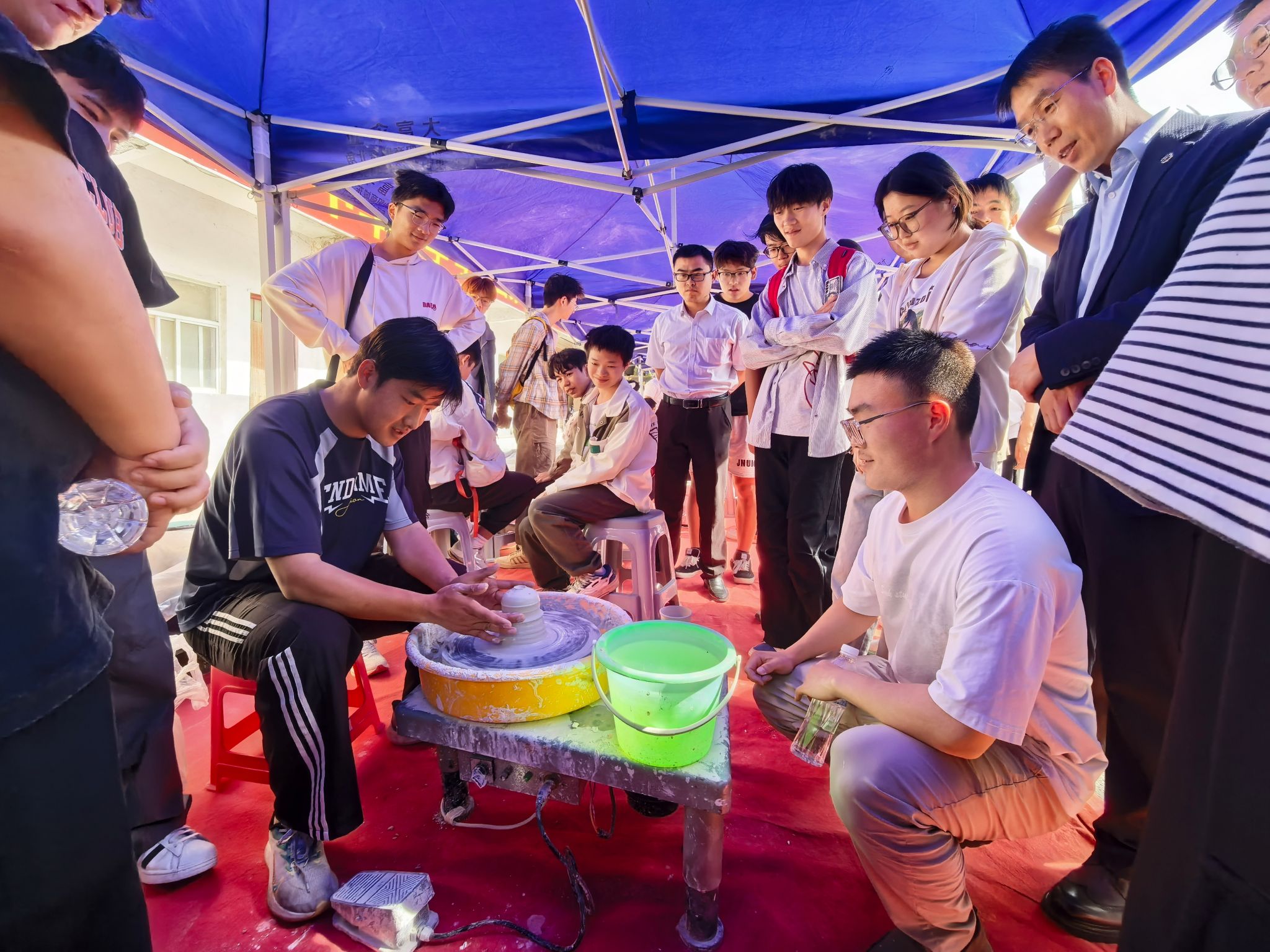 国家级非遗传承人柴战柱以绞胎瓷的悠久历史和东方美学传承为切入点,系统阐释了绞胎瓷工艺的制作技艺与文化价值,深入剖析其作为重要文化载体的历史底蕴,强调“非遗传承是守护中华文明根脉的重要实践”。绞胎瓷制作师傅们带领学生对调色揉泥、拉坯镶嵌、施釉烧制等工艺进行手把手教学,感受绞胎瓷内外相通、表里如一的特质和独树一帜的艺术风格。