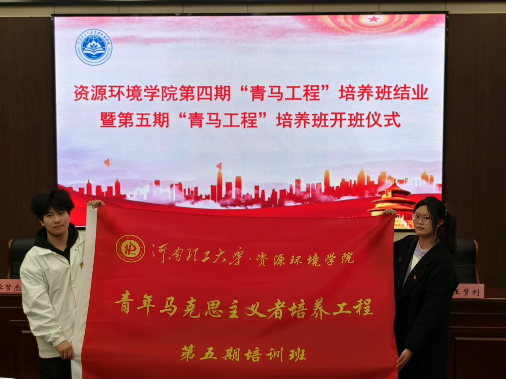 为深入贯彻落实习近平总书记关于青年工作的重要论述,培养一批理想信念坚定、政治素质过硬、具备卓越能力素质的青年学生骨干,11月26日下午,我院于资环学院第I学术报告厅举行第四期“青马工程”培养班结业暨第五期“青马工程”培养班开班仪式。院党委书记桑俊勇、院党委副书记孙付伟、院专职组织员武宝宝、院团委副书记王梦利和2023级辅导员李梦杰参加仪式。仪式由孙付伟主持。