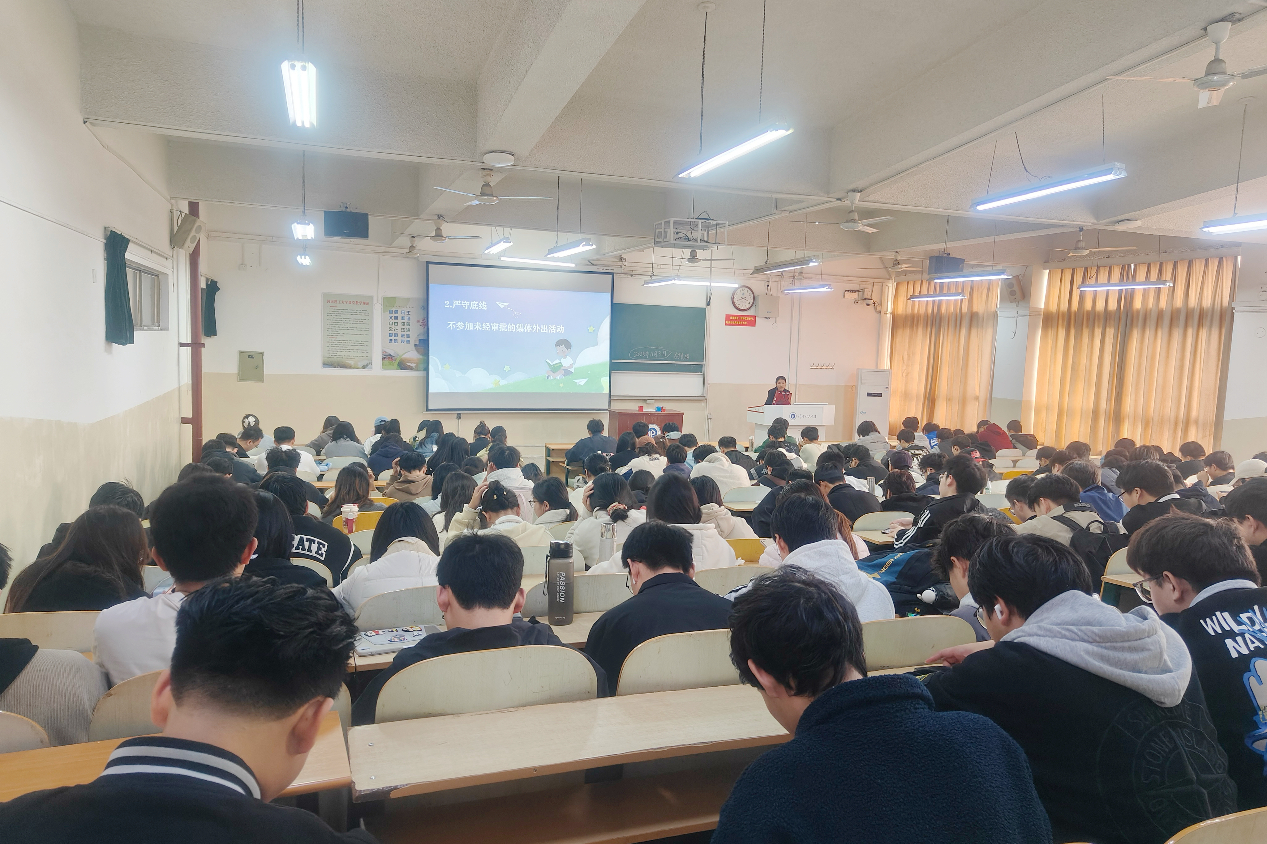 班会上,辅导员首先介绍了学校“自强不息、奋发向上”的办学精神、“明德任责”的校训以及“好学力行”的校风,引导学生对照自身行为,反思是否真正做到知行合一。随后,结合近年来学生中出现的考试作弊、违规用电、打架斗殴、发表不当言论等违纪案例,班会详细解读了《河南理工大学学生违纪处理实施细则》的主要内容,包括处分的种类、适用情形、处理程序及申诉机制等。此外,班会还介绍了学校“学生综合事务服务大厅”的相关服务信息,包括办公地址、时间及联系方式,鼓励同学们在遇到学业、生活、纪律等方面的困惑时主动咨询、依法依规解决问题。